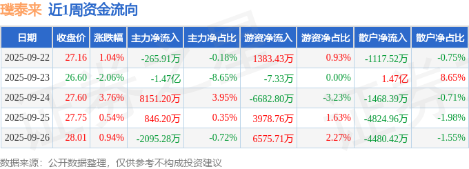 资金流向数据方面,本周璞泰来主力资金合计净流出8091.59万元,游资资金合计净流入5247.76万元,散户资金合计净流入2843.83万元。本周资金流向一览见下表: