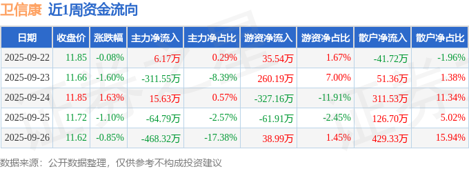 资金流向数据方面,本周卫信康主力资金合计净流出822.85万元,游资资金合计净流出54.35万元,散户资金合计净流入877.2万元。本周资金流向一览见下表: