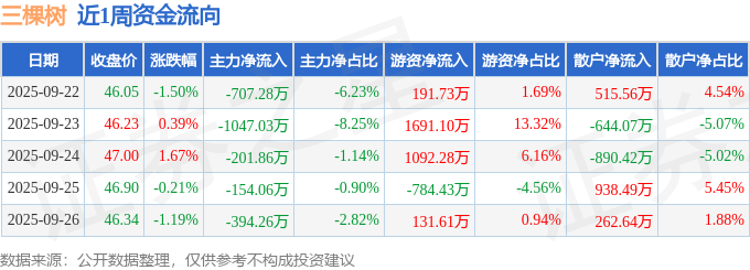 资金流向数据方面,本周三棵树主力资金合计净流出2504.49万元,游资资金合计净流入2322.29万元,散户资金合计净流入182.2万元。本周资金流向一览见下表: