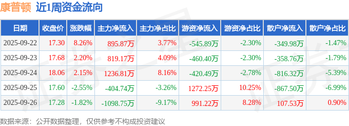 资金流向数据方面,本周康普顿主力资金合计净流入1448.35万元,游资资金合计净流入836.69万元,散户资金合计净流出2285.03万元。本周资金流向一览见下表:
