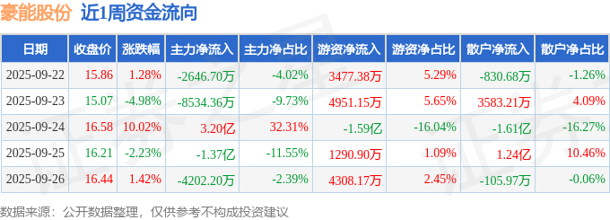 资金流向数据方面,本周豪能股份主力资金合计净流入2913.54万元,游资资金合计净流出1853.46万元,散户资金合计净流出1060.08万元。本周资金流向一览见下表: