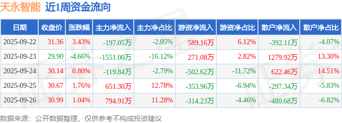 资金流向数据方面,本周天永智能主力资金合计净流出421.68万元,游资资金合计净流出310.57万元,散户资金合计净流入732.25万元。本周资金流向一览见下表: