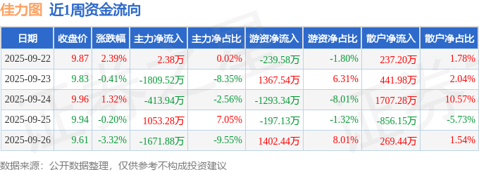 资金流向数据方面,本周佳力图主力资金合计净流出2839.68万元,游资资金合计净流入1039.92万元,散户资金合计净流入1799.75万元。本周资金流向一览见下表: