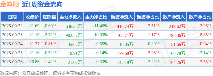 资金流向数据方面,本周金鸿顺主力资金合计净流出1606.51万元,游资资金合计净流入542.9万元,散户资金合计净流入1063.61万元。本周资金流向一览见下表: