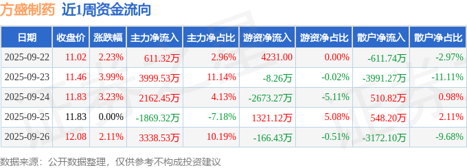 资金流向数据方面,本周方盛制药主力资金合计净流入8242.51万元,游资资金合计净流出1526.42万元,散户资金合计净流出6716.09万元。本周资金流向一览见下表: