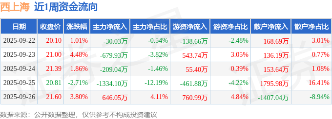资金流向数据方面,本周西上海主力资金合计净流出1607.05万元,游资资金合计净流入759.59万元,散户资金合计净流入847.46万元。本周资金流向一览见下表: