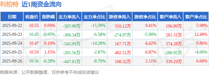 资金流向数据方面,本周利柏特主力资金合计净流出2004.51万元,游资资金合计净流入793.68万元,散户资金合计净流入1210.82万元。本周资金流向一览见下表: