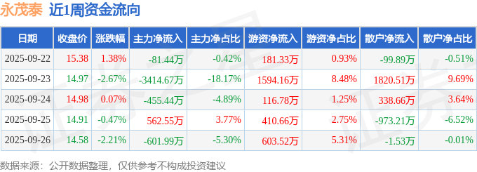 资金流向数据方面,本周永茂泰主力资金合计净流出3990.98万元,游资资金合计净流入2906.44万元,散户资金合计净流入1084.54万元。本周资金流向一览见下表:
