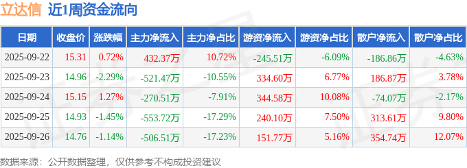 资金流向数据方面,本周立达信主力资金合计净流出1419.84万元,游资资金合计净流入825.55万元,散户资金合计净流入594.29万元。本周资金流向一览见下表: