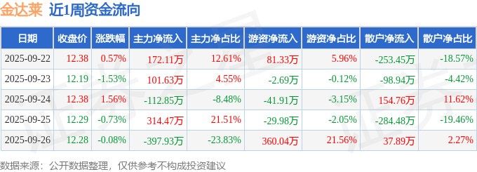 资金流向数据方面,本周金达莱主力资金合计净流入77.43万元,游资资金合计净流入366.79万元,散户资金合计净流出444.23万元。本周资金流向一览见下表: