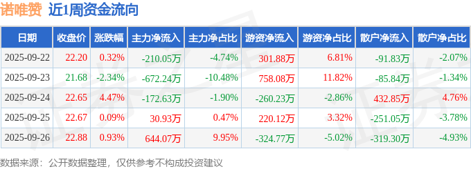 资金流向数据方面,本周诺唯赞主力资金合计净流出379.92万元,游资资金合计净流入695.08万元,散户资金合计净流出315.16万元。本周资金流向一览见下表: