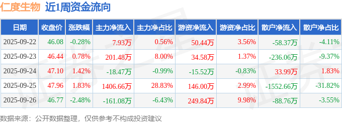 资金流向数据方面,本周仁度生物主力资金合计净流入1436.52万元,游资资金合计净流入465.34万元,散户资金合计净流出1901.85万元。本周资金流向一览见下表: