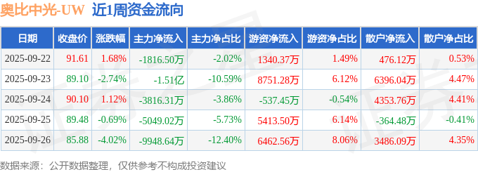 资金流向数据方面,本周奥比中光主力资金合计净流出3.58亿元,游资资金合计净流入2.14亿元,散户资金合计净流入1.43亿元。本周资金流向一览见下表: