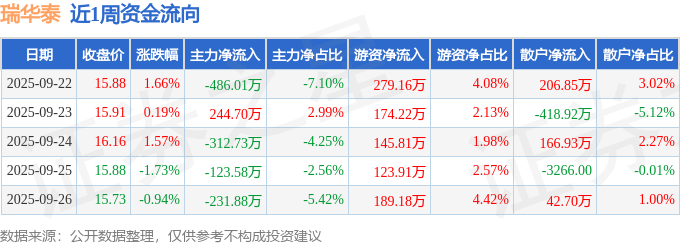资金流向数据方面,本周瑞华泰主力资金合计净流出909.5万元,游资资金合计净流入912.27万元,散户资金合计净流出2.76万元。本周资金流向一览见下表:
