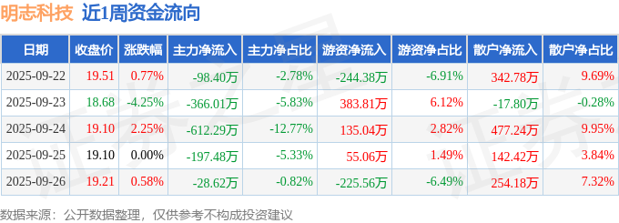 资金流向数据方面,本周明志科技主力资金合计净流出1302.79万元,游资资金合计净流入103.97万元,散户资金合计净流入1198.82万元。本周资金流向一览见下表: