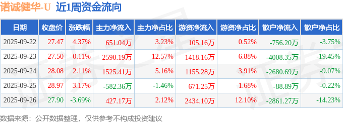 资金流向数据方面,本周诺诚健华主力资金合计净流入4611.45万元,游资资金合计净流入5783.95万元,散户资金合计净流出1.04亿元。本周资金流向一览见下表: