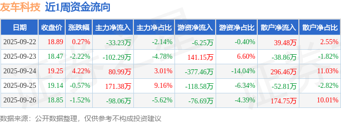 资金流向数据方面,本周友车科技主力资金合计净流入18.8万元,游资资金合计净流出437.83万元,散户资金合计净流入419.03万元。本周资金流向一览见下表: