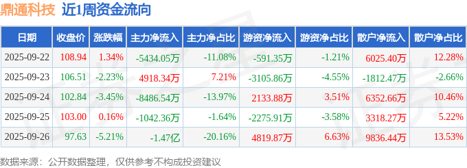 资金流向数据方面,本周鼎通科技主力资金合计净流出2.47亿元,游资资金合计净流入980.62万元,散户资金合计净流入2.37亿元。本周资金流向一览见下表: