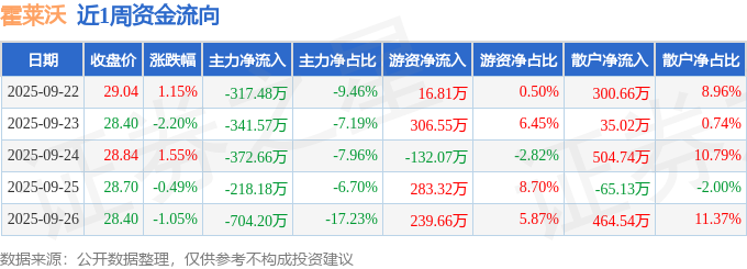 资金流向数据方面,本周霍莱沃主力资金合计净流出1954.09万元,游资资金合计净流入714.27万元,散户资金合计净流入1239.82万元。本周资金流向一览见下表: