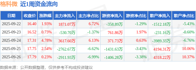资金流向数据方面,本周格科微主力资金合计净流出716.63万元,游资资金合计净流出2063.22万元,散户资金合计净流入2779.85万元。本周资金流向一览见下表: