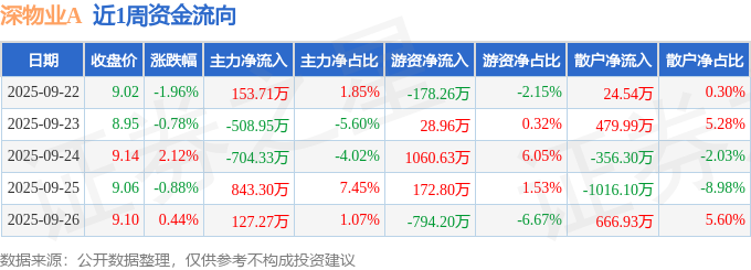 资金流向数据方面,本周深物业A主力资金合计净流出89.0万元,游资资金合计净流入289.93万元,散户资金合计净流出200.93万元。本周资金流向一览见下表: