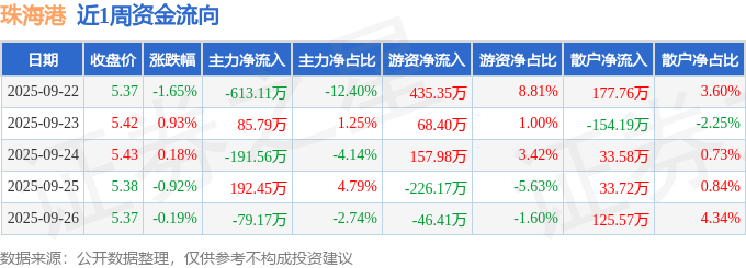 资金流向数据方面,本周珠海港主力资金合计净流出605.6万元,游资资金合计净流入389.15万元,散户资金合计净流入216.45万元。本周资金流向一览见下表: