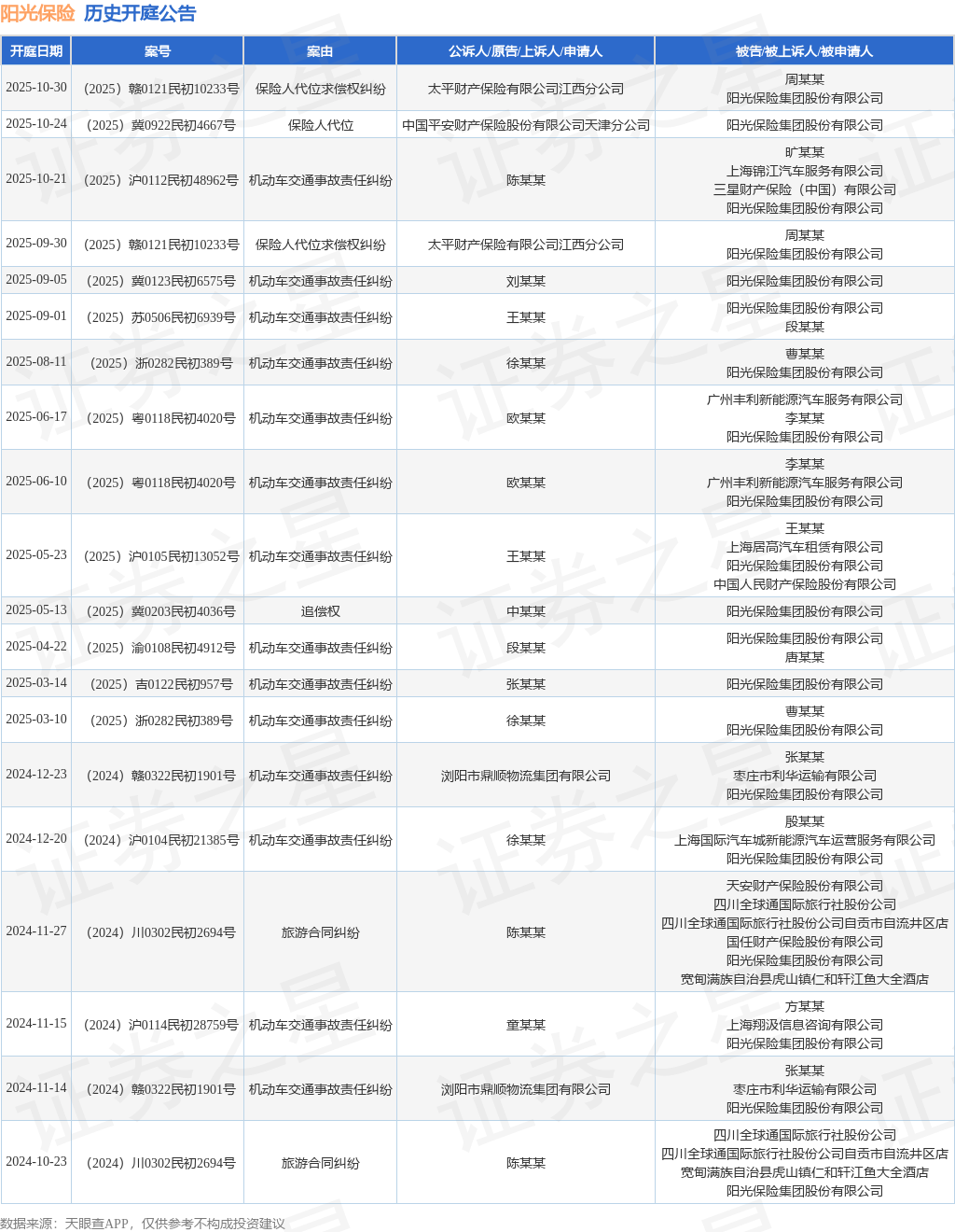 案号:(2025)赣0121民初10233号根据统计,近一年内以阳光保险集团股份有限公司为当事人的历史开庭公告有20则,其中案由为“机动车交通事故责任纠纷”的公告以14则居首,其次为“保险人代位求偿权纠纷”有2则,“旅游合同纠纷”有2则。历史开庭公告如下: