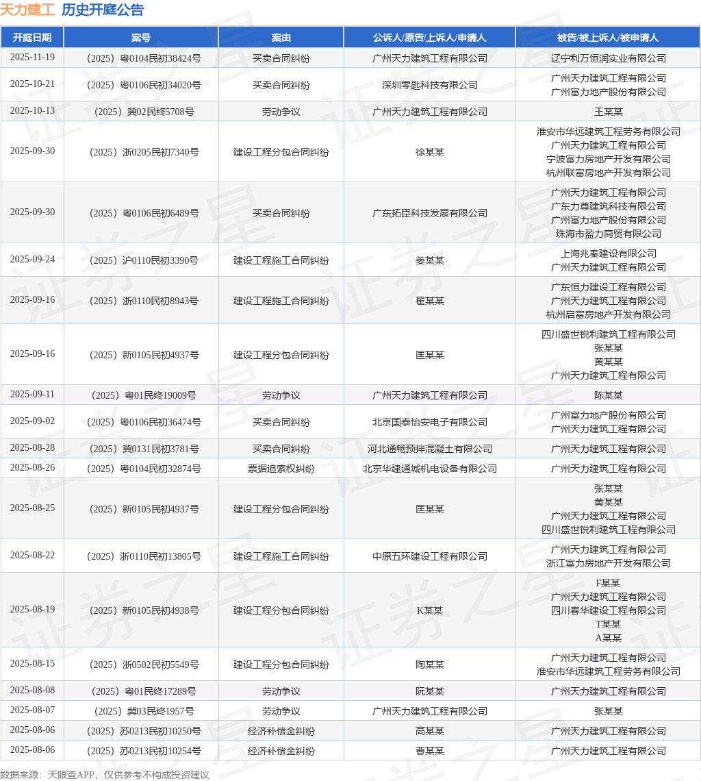 案号:(2025)粤0106民初6489号根据统计,近一年内以广州天力建筑工程有限公司为当事人的历史开庭公告有392则,其中案由为“买卖合同纠纷”的公告以136则居首,其次为“劳动争议”有61则,“票据追索权纠纷”有33则。历史开庭公告(前20条)如下: