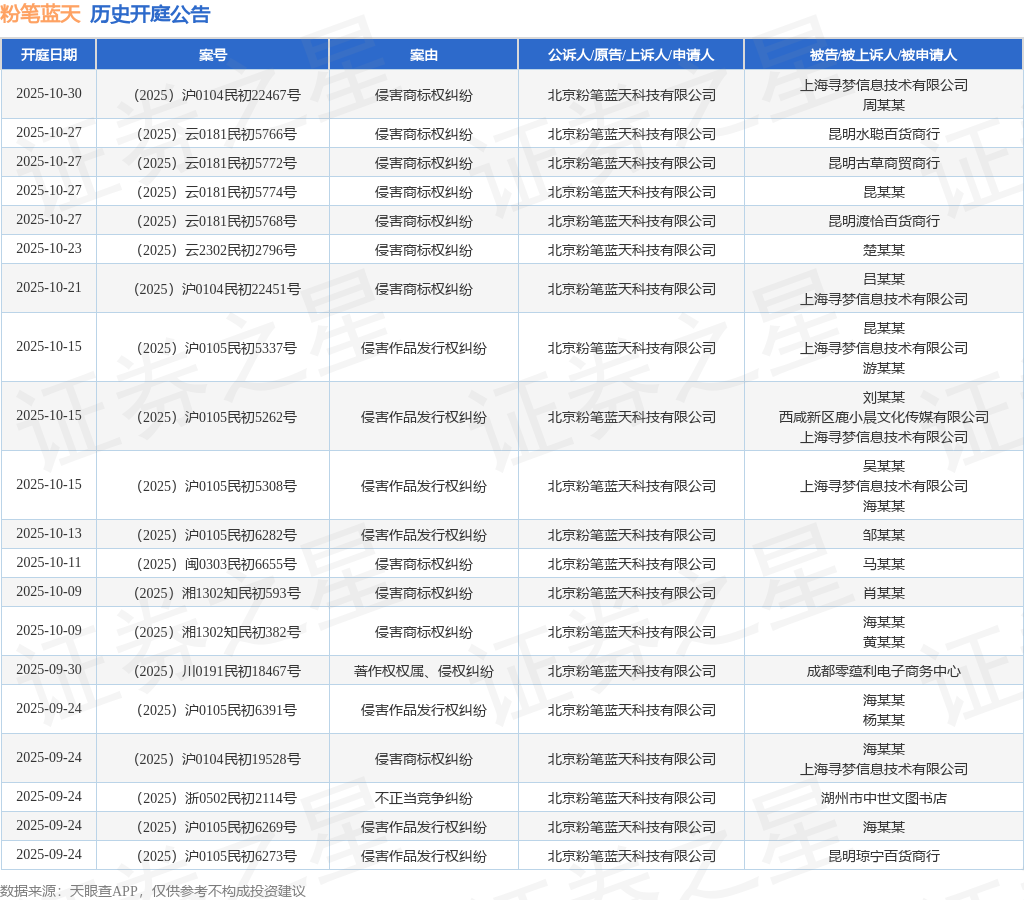 案号:(2025)川0191民初18467号根据统计,近一年内以北京粉笔蓝天科技有限公司为当事人的历史开庭公告有378则,其中案由为“侵害作品发行权纠纷”的公告以243则居首,其次为“侵害商标权纠纷”有109则,“著作权权属、侵权纠纷”有9则。历史开庭公告(前20条)如下: