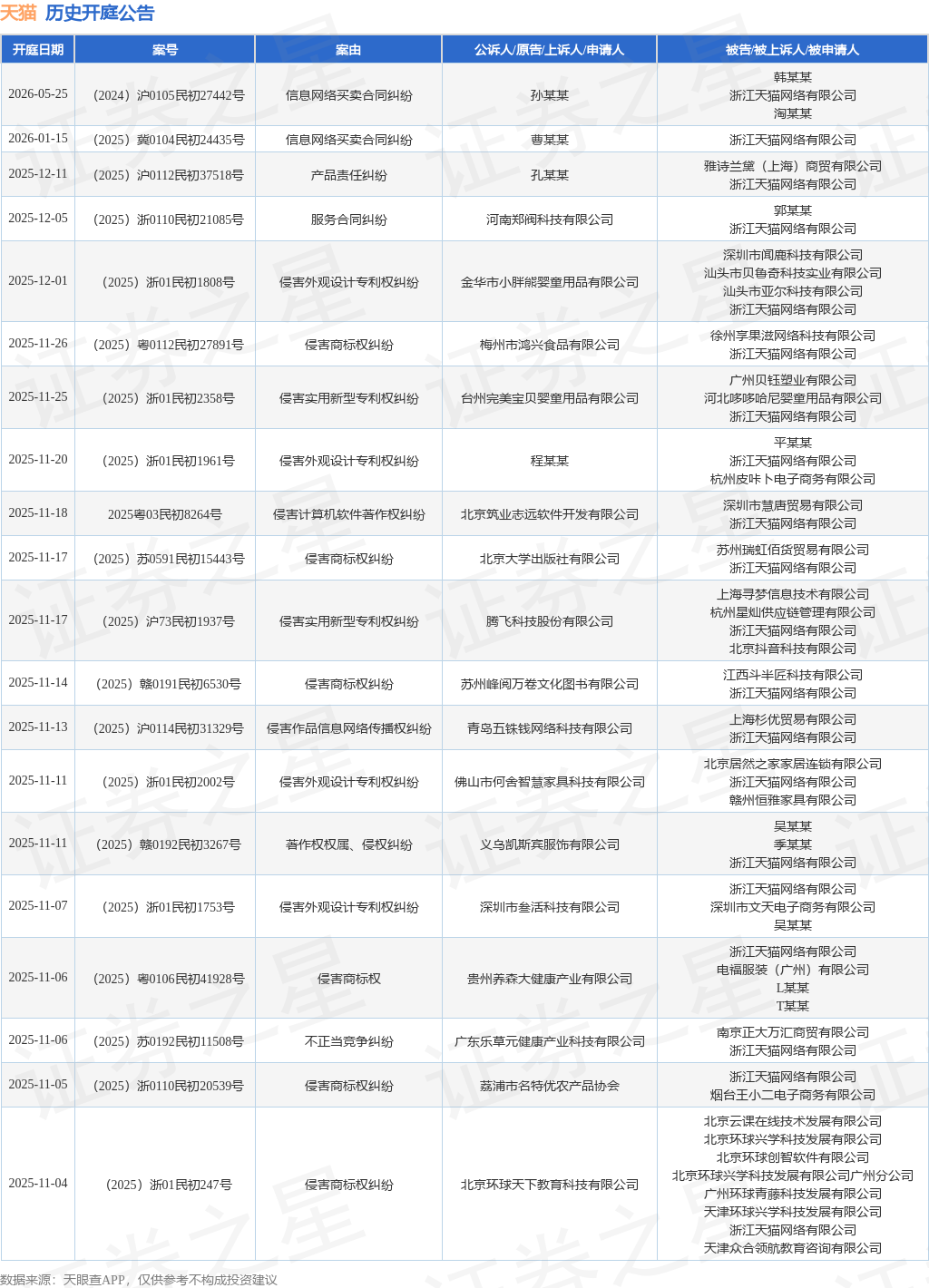 案号:(2025)浙0110民初21913号根据统计,近一年内以浙江天猫网络有限公司为当事人的历史开庭公告有2401则,其中案由为“著作权权属、侵权纠纷”的公告以597则居首,其次为“侵害商标权纠纷”有405则,“侵害外观设计专利权纠纷”有377则。历史开庭公告(前20条)如下: