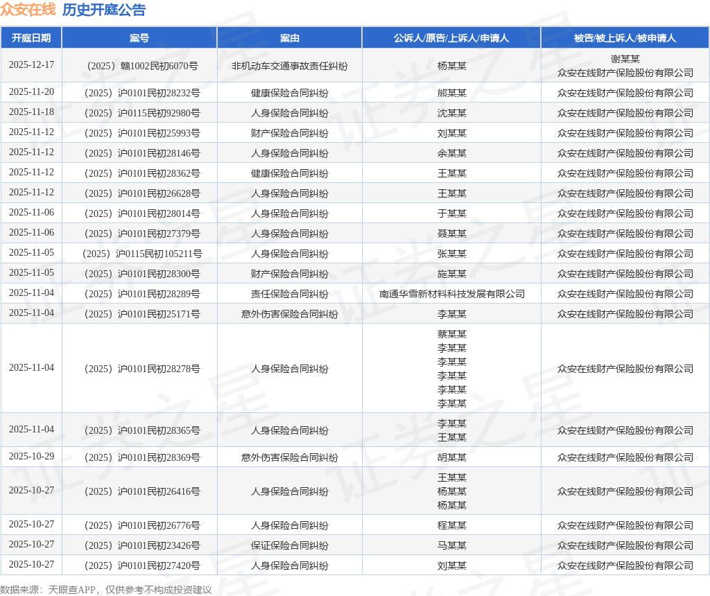 证券之星消息,根据天眼查APP显示,近日公布了一则众安在线财产保险股份有限公司作为被告/被上诉人的开庭公告,详细内容如下:
