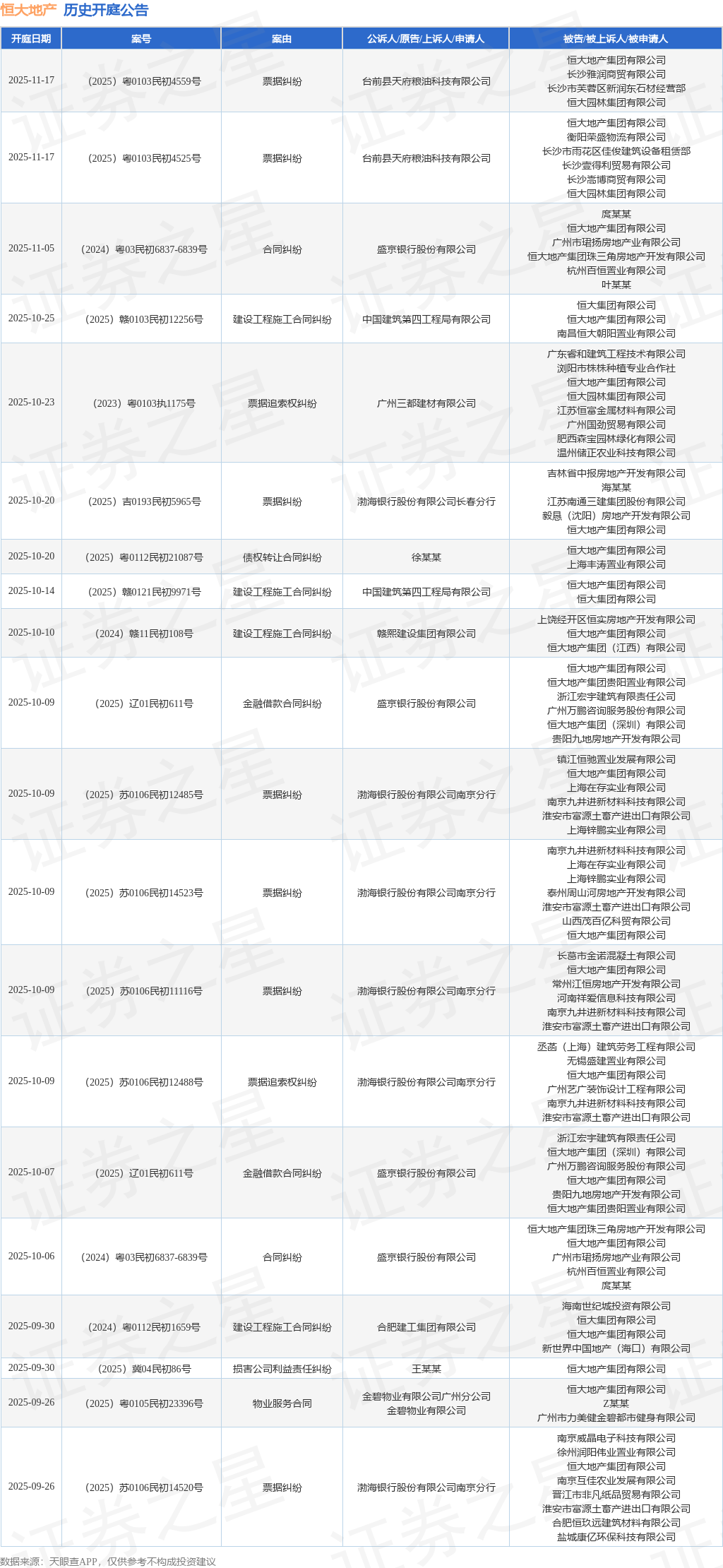 案号:(2024)粤0112民初1659号根据统计,近一年内以恒大地产集团有限公司为当事人的历史开庭公告有1112则,其中案由为“票据纠纷”的公告以309则居首,其次为“合同纠纷”有230则,“建设工程施工合同纠纷”有174则。历史开庭公告(前20条)如下: