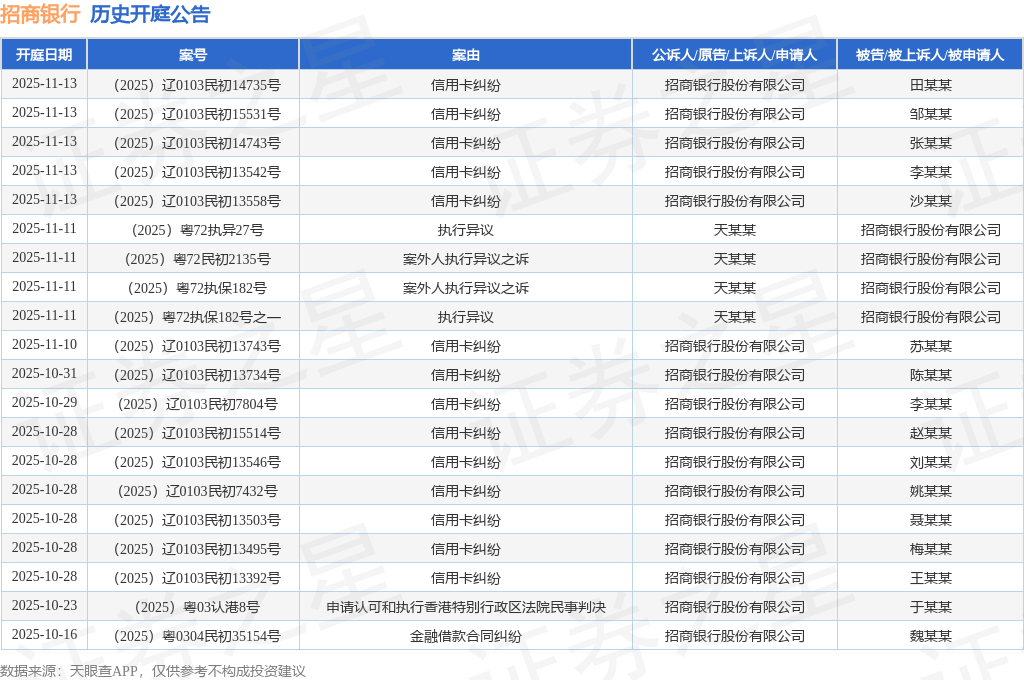 案号:(2025)粤0192民初18715号根据统计,近一年内以招商银行股份有限公司为当事人的历史开庭公告有955则,其中案由为“信用卡纠纷”的公告以462则居首,其次为“金融借款合同纠纷”有418则,“借款合同纠纷”有36则。历史开庭公告(前20条)如下: