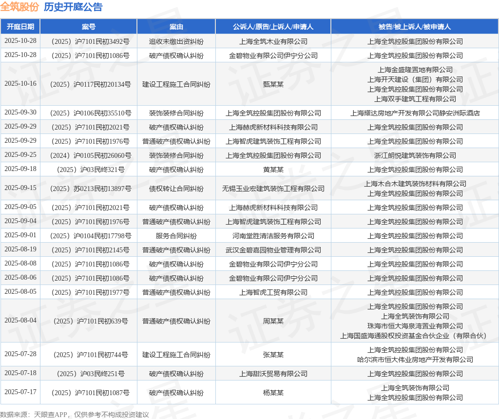 案号:(2025)沪0106民初35510号根据统计,近一年内以上海全筑控股集团股份有限公司为当事人的历史开庭公告有97则,其中案由为“破产债权确认纠纷”的公告以18则居首,其次为“装饰装修合同纠纷”有17则,“建设工程施工合同纠纷”有14则。历史开庭公告(前20条)如下:
