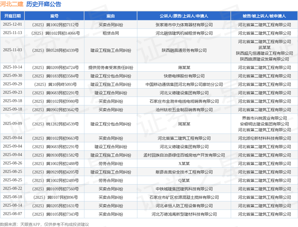 案号:(2025)冀0183民初3584号根据统计,近一年内以河北省第二建筑工程有限公司为当事人的历史开庭公告有101则,其中案由为“买卖合同纠纷”的公告以34则居首,其次为“建设工程施工合同纠纷”有22则,“建设工程分包合同纠纷”有11则。历史开庭公告(前20条)如下:
