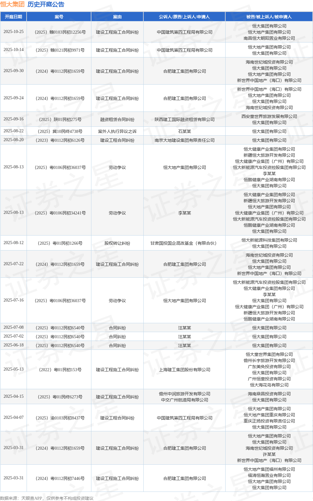 案号:(2024)粤0112民初1659号根据统计,近一年内以恒大集团有限公司为当事人的历史开庭公告有49则,其中案由为“建设工程施工合同纠纷”的公告以23则居首,其次为“合同纠纷”有8则,“劳动争议”有3则。历史开庭公告(前20条)如下: