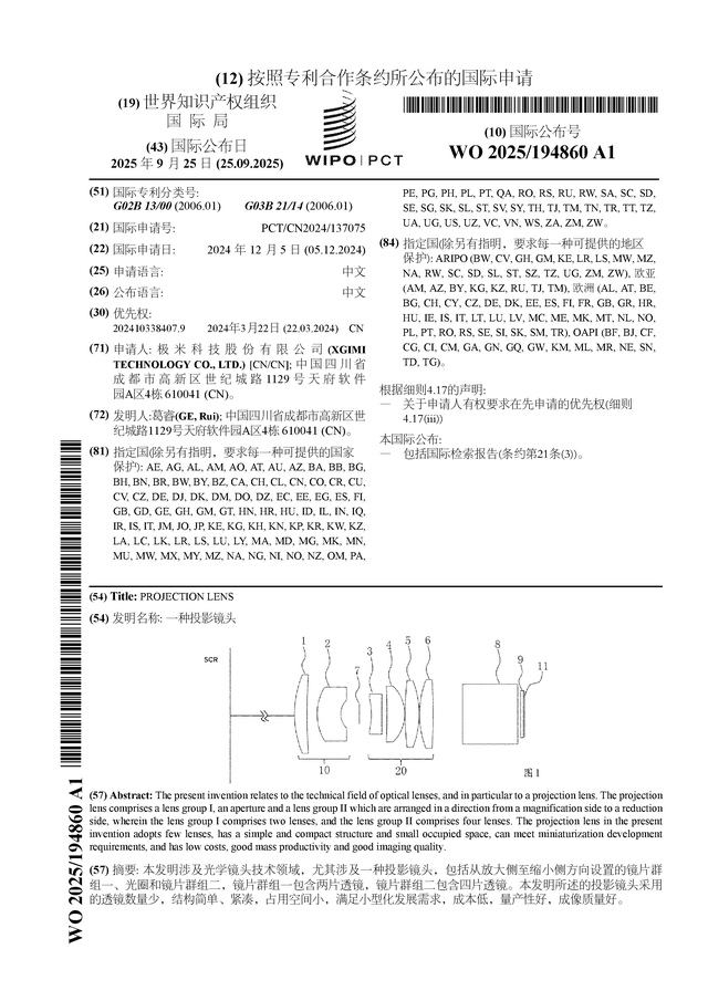 证券之星消息,根据企查查数据显示极米科技(688696)公布了一项国际专利申请,专利名为“一种投影镜头”,专利申请号为PCT/CN2024/137075,国际公布日为2025年9月25日。