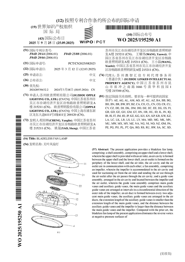 证券之星消息,根据企查查数据显示欧普照明(603515)公布了一项国际专利申请,专利名为“无叶风扇灯”,专利申请号为PCT/CN2025/082023,国际公布日为2025年9月25日。