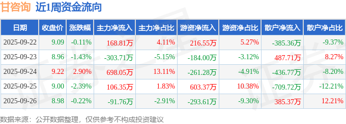 资金流向数据方面,本周甘咨询主力资金合计净流入577.74万元,游资资金合计净流入81.02万元,散户资金合计净流出658.76万元。本周资金流向一览见下表: