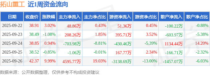 资金流向数据方面,本周拓山重工主力资金合计净流入4147.84万元,游资资金合计净流出2954.3万元,散户资金合计净流出1193.54万元。本周资金流向一览见下表: