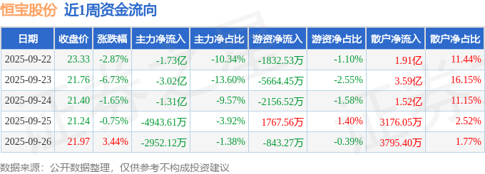 资金流向数据方面,本周恒宝股份主力资金合计净流出6.84亿元,游资资金合计净流出8729.2万元,散户资金合计净流入7.71亿元。本周资金流向一览见下表:
