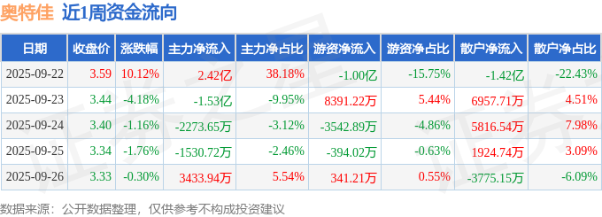 资金流向数据方面,本周奥特佳主力资金合计净流入8528.73万元,游资资金合计净流出5209.13万元,散户资金合计净流出3319.6万元。本周资金流向一览见下表: