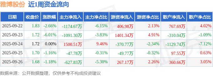 资金流向数据方面,本周雅博股份主力资金合计净流出1441.08万元,游资资金合计净流入1654.97万元,散户资金合计净流出213.89万元。本周资金流向一览见下表:
