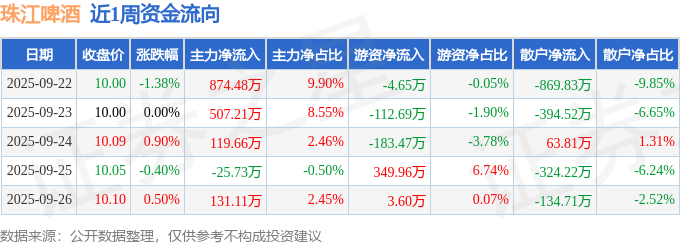 资金流向数据方面,本周珠江啤酒主力资金合计净流入1606.72万元,游资资金合计净流入52.75万元,散户资金合计净流出1659.47万元。本周资金流向一览见下表: