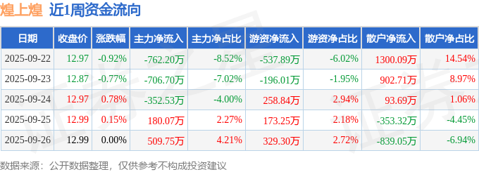 资金流向数据方面,本周煌上煌主力资金合计净流出1131.61万元,游资资金合计净流入27.49万元,散户资金合计净流入1104.11万元。本周资金流向一览见下表: