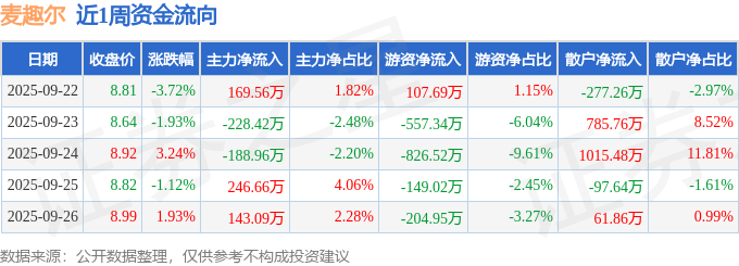 资金流向数据方面,本周麦趣尔主力资金合计净流入141.93万元,游资资金合计净流出1630.13万元,散户资金合计净流入1488.2万元。本周资金流向一览见下表: