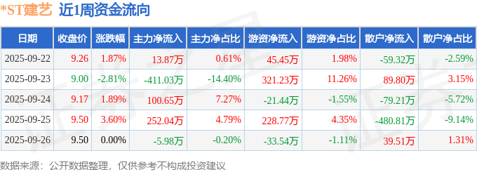 资金流向数据方面,本周*ST建艺主力资金合计净流出50.44万元,游资资金合计净流入540.48万元,散户资金合计净流出490.03万元。本周资金流向一览见下表: