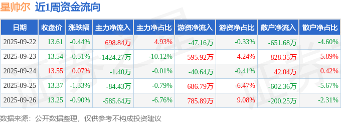 资金流向数据方面,本周星帅尔主力资金合计净流出1396.89万元,游资资金合计净流入1980.8万元,散户资金合计净流出583.9万元。本周资金流向一览见下表: