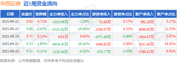 资金流向数据方面,本周华西证券主力资金合计净流出1.54亿元,游资资金合计净流入2752.25万元,散户资金合计净流入1.27亿元。本周资金流向一览见下表: