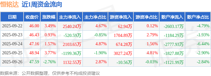 资金流向数据方面,本周恒铭达主力资金合计净流入4056.49万元,游资资金合计净流入5458.78万元,散户资金合计净流出9515.27万元。本周资金流向一览见下表: